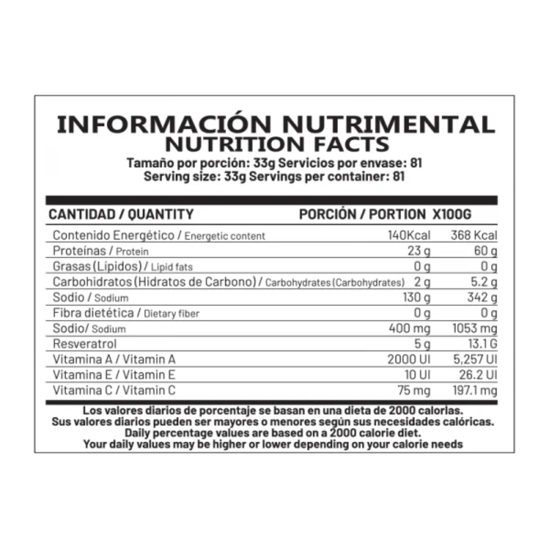 23g de proteína pura con solo 2g de carbohidratos y 0g de grasa por porción de 33g. Perfil macronutricional limpio y preciso ideal para músculo definido sin acumular lo que no se necesita.